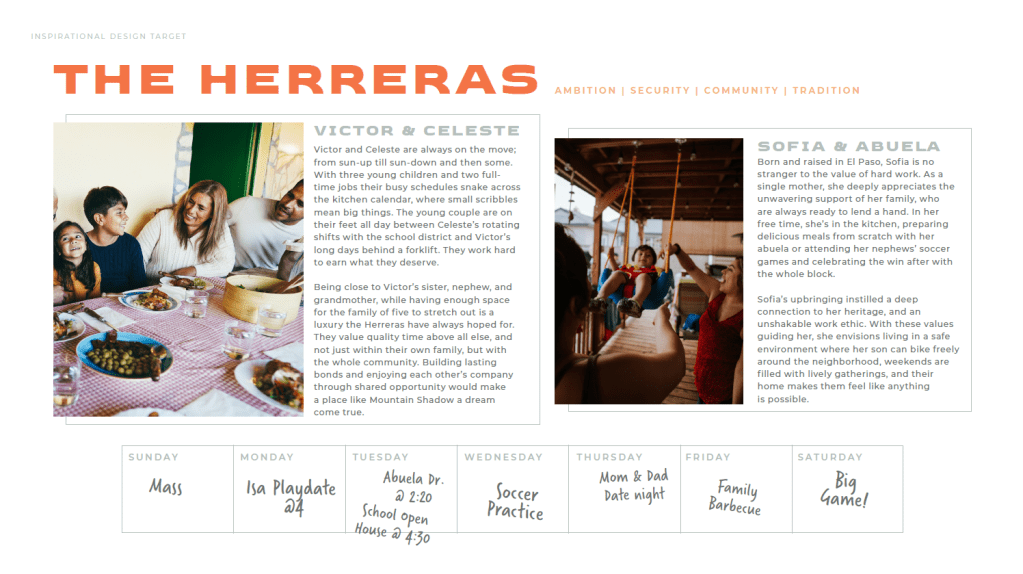 The Inspirational design target is meant to be directive about the type of people who may choose to live at Mountain Shadow. Rather than inspired by data, the audience is more a conceptual persona of what residents here may value, how they spend their time, and what they’re looking for in a home.