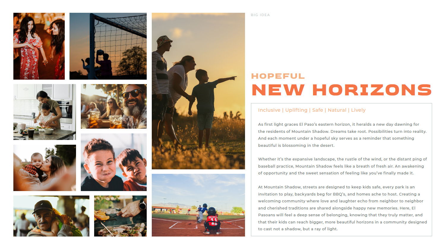 Mountain Shadow is a 4,000-acre mixed-use master-planned community east of El Paso. I developed the brand strategy and worked with brand designers to use it to guide the visual identity. Positioned to build community, follow dreams, and celebrate culture, Mountain Shadow is the place to set down roots, build a home, and reap the rewards of hard work.