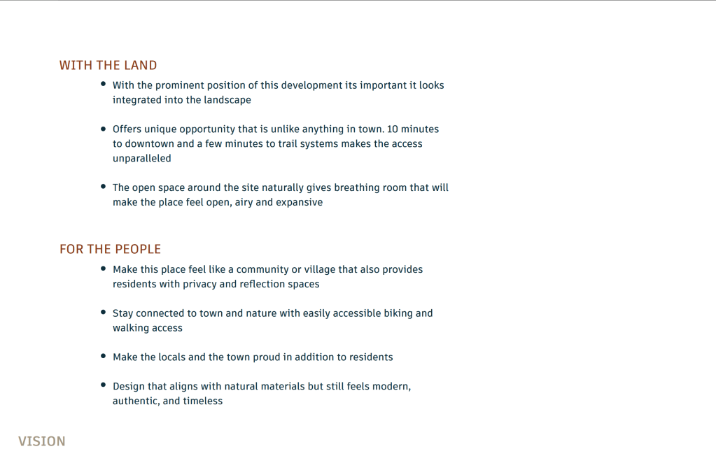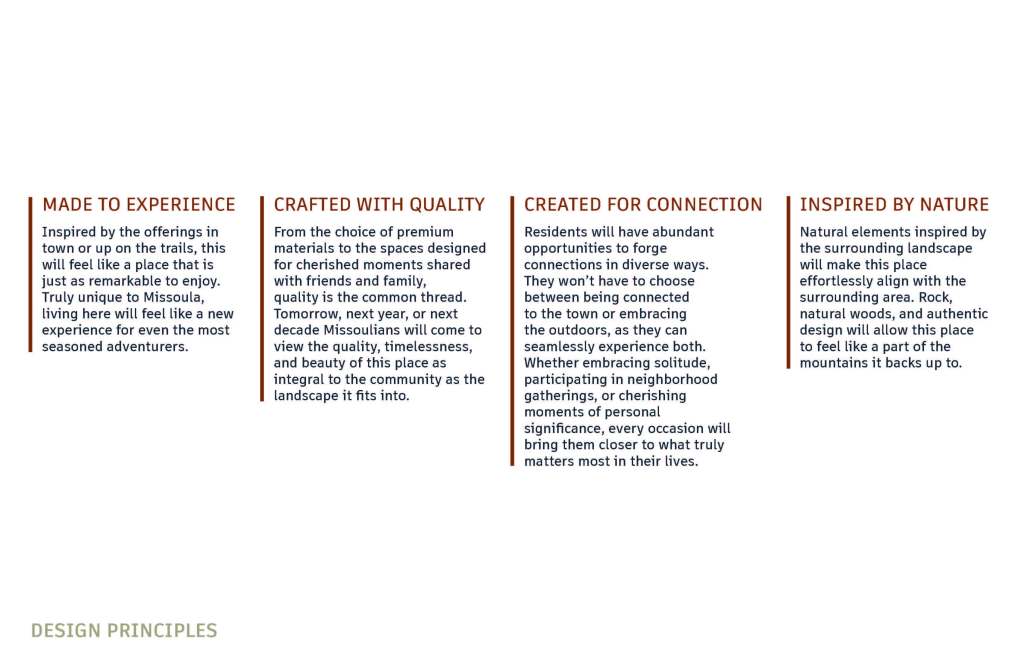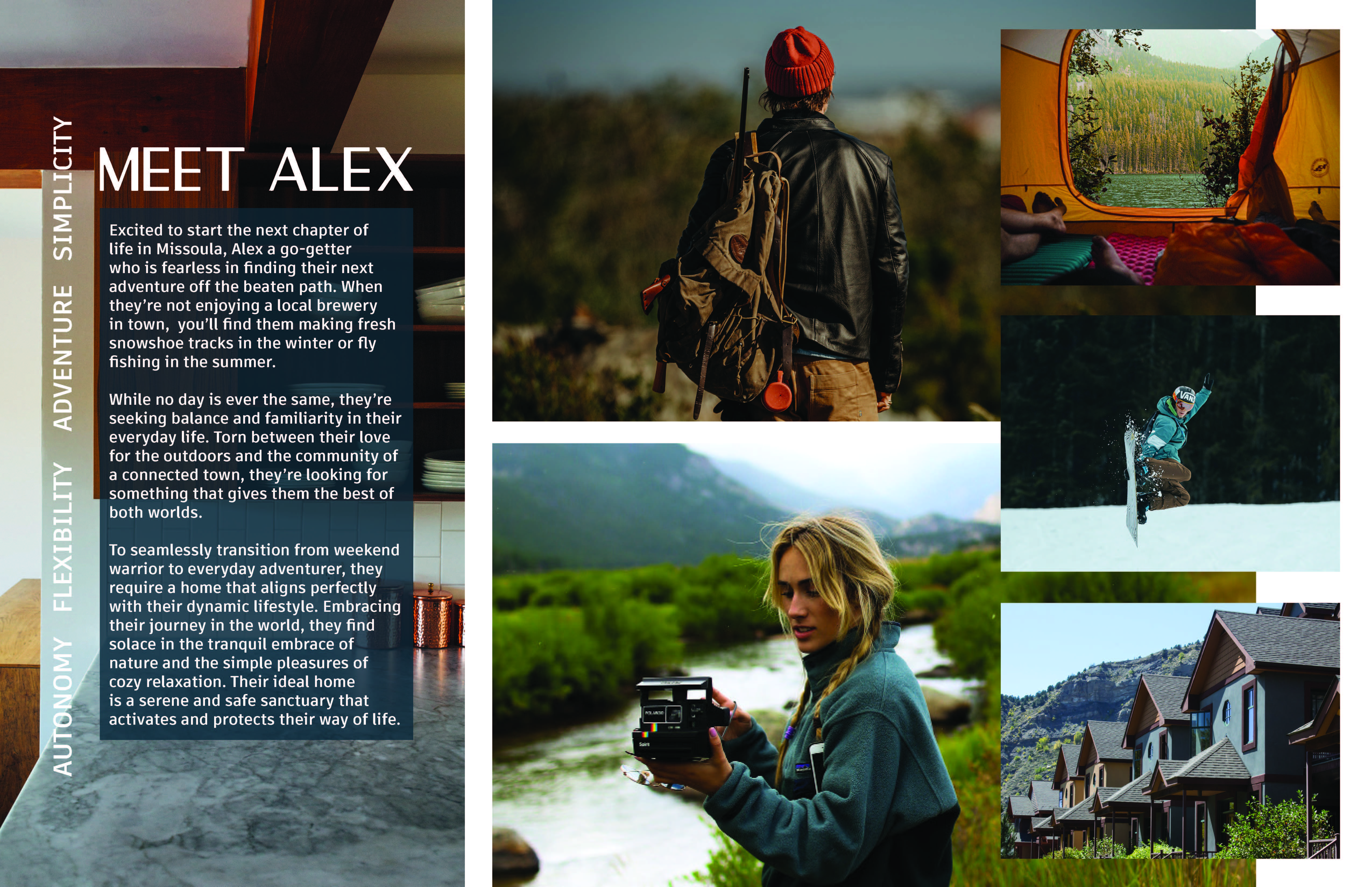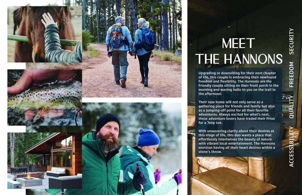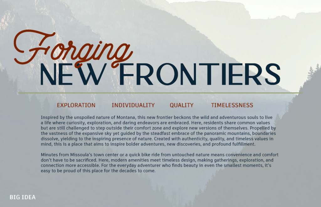 To truly understand this place, its potential residents, and its essence, I helped to conduct extensive research. This involved studying the location, the intended audience, and the unique characteristics of Missoula, Montana. The findings of this research were then presented to the client, ensuring that the ideas, story, and personas developed for the brand are not just a vision, but a well-informed reality.